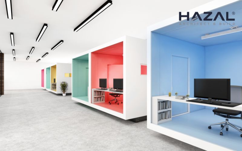 Hazal Decor tận dụng màu sắc và ánh sáng để tạo điểm nhấn và cung cấp không gian làm việc tươi mới, sáng sủa và động lực. Việc áp dụng màu sắc và ánh sáng sẽ mang lại không gian làm việc sinh động và phấn khích.